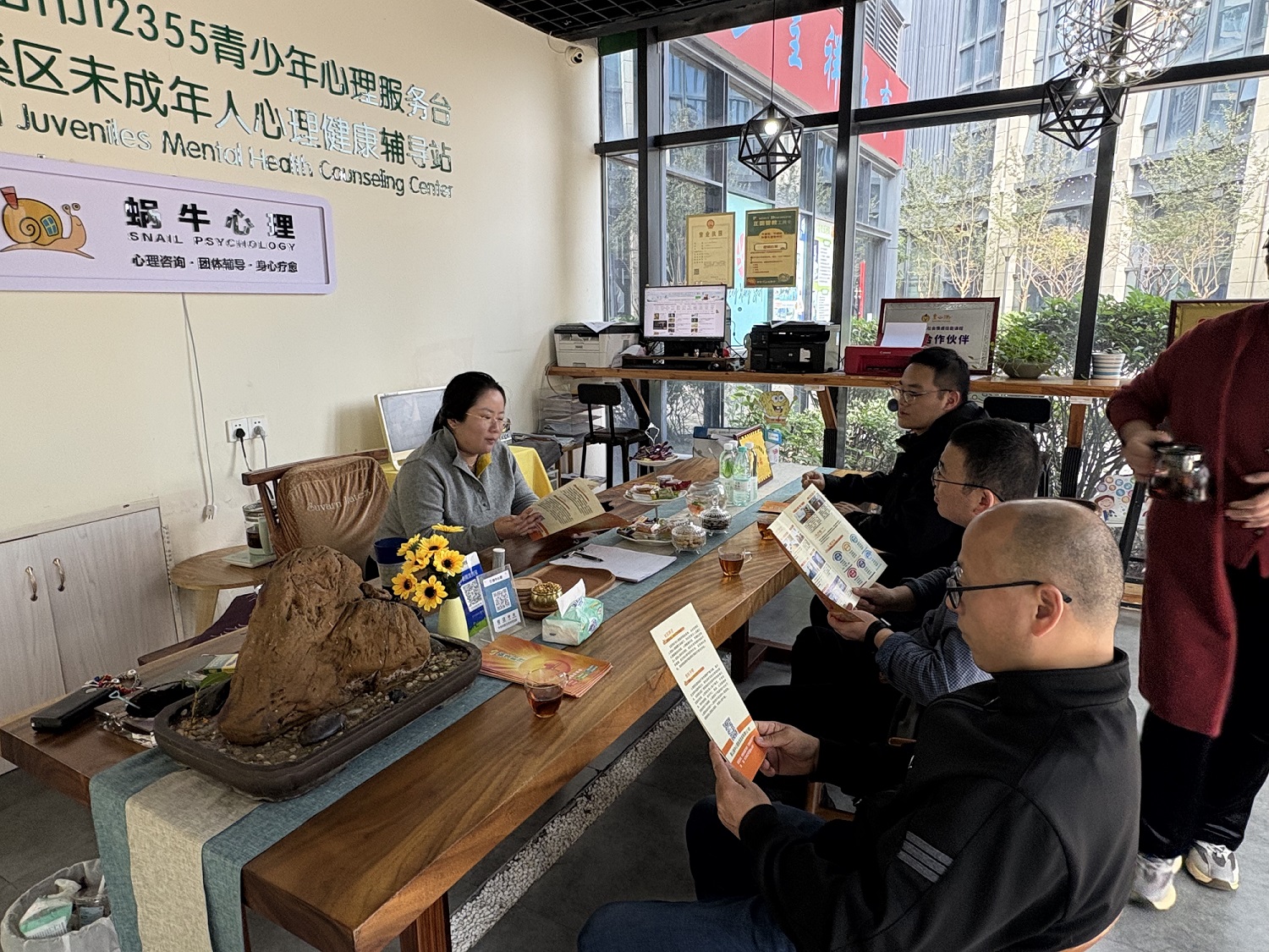 在黄山蜗牛心理教育咨询有限公司,调研组详细了解了其依托黄山市12355青少年心理服务台和屯溪区未成年人心理辅导站建设开展的社会心理服务情况。学院共青团同步发力,以此次访企为契机搭建就业对接桥梁,助力学生精准对接结业岗位。公司负责人对太阳集团tyc9728学生的专业素养和综合表现给予了高度评价,并表示愿意持续接收实习生,共同构建“教学—实践—就业”一体化平台。